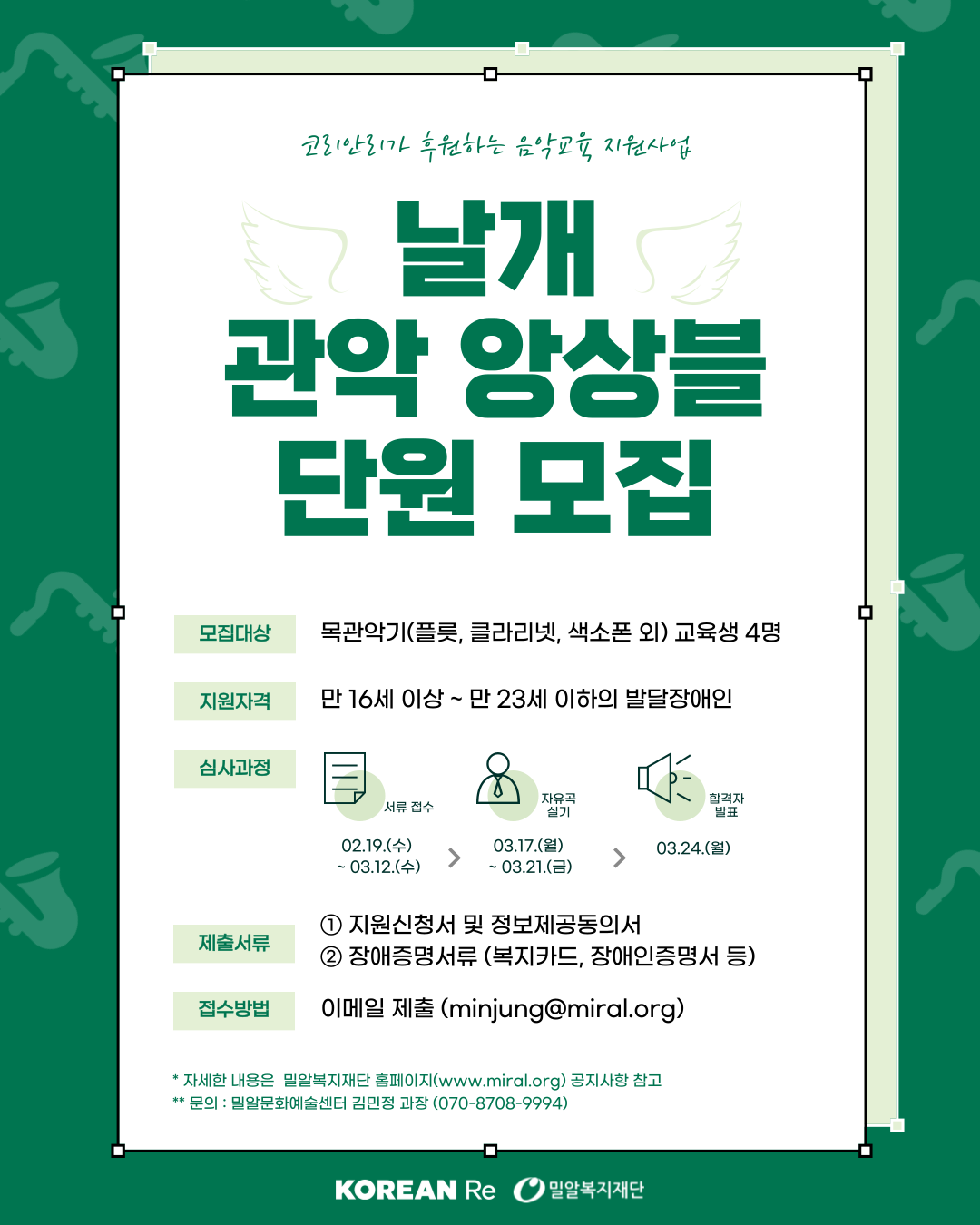 날개 관악 앙상블은 코리안리의 후원으로 밀알복지재단이 운영하는 음악교육 지원사업으로